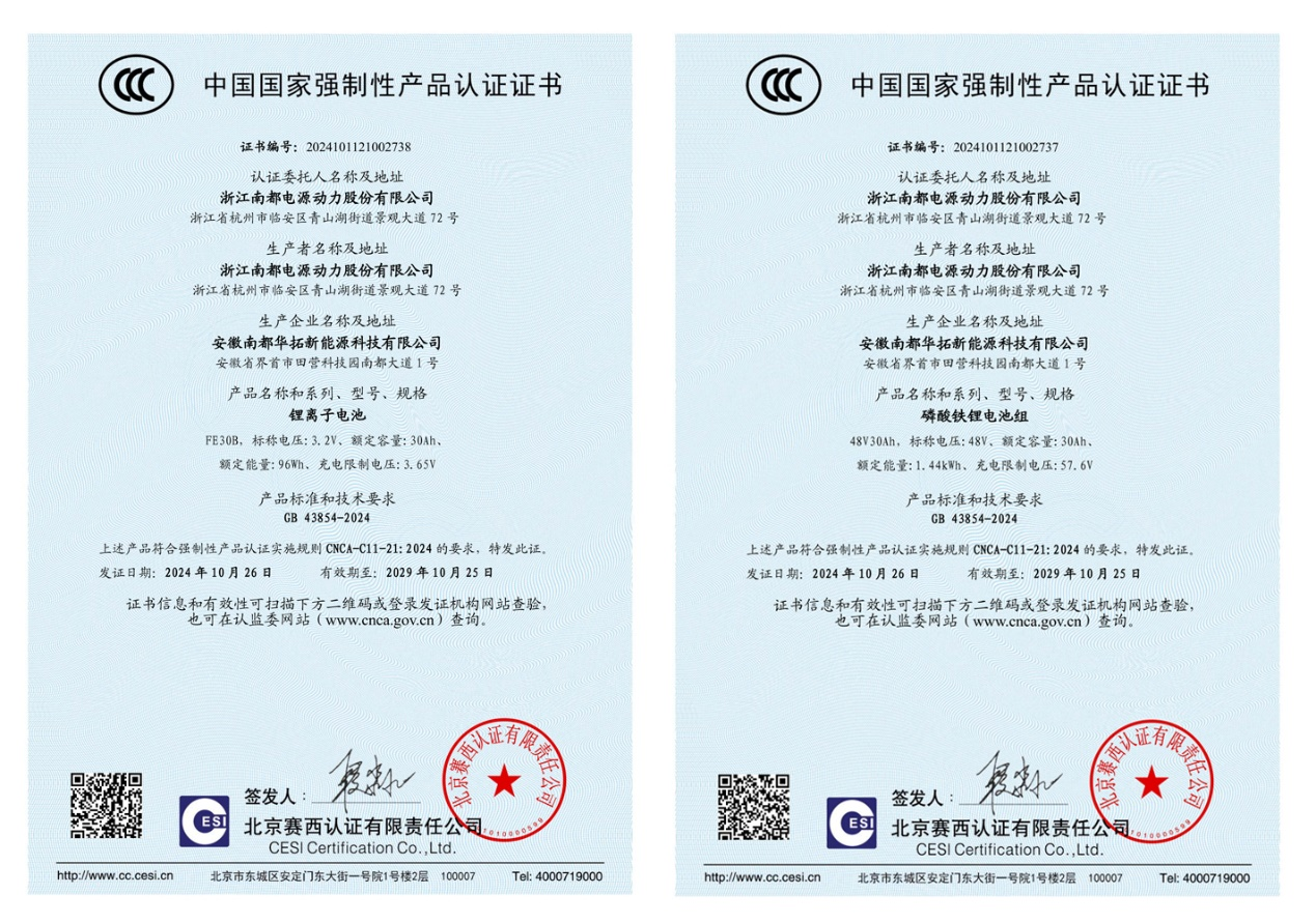 JDB电子起劲响应治理要求,,,,,,,通过提升电池的清静性能、能量密度、循环寿命及情形顺应性等要害指标,,,,,,,率先通过GB 43854国家强制标准,,,,,,,同时申请产品CCC认证。。。。。